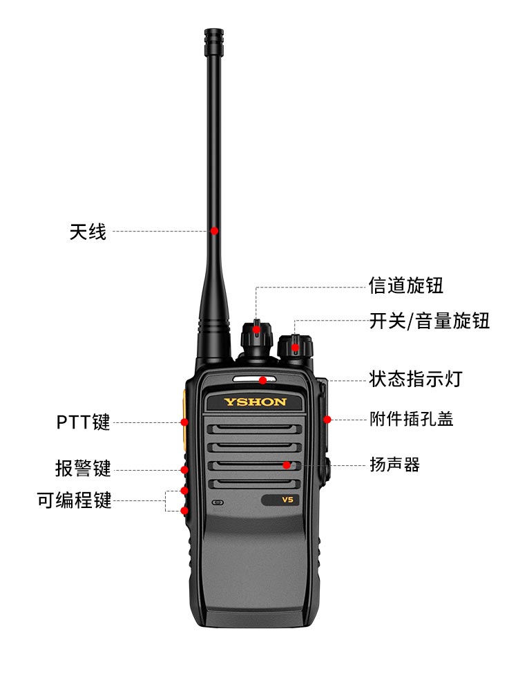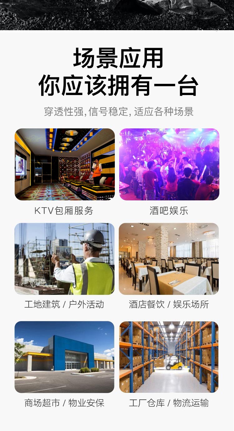 LS-V5可一键解码对频,匹配市面上大部分品牌对讲机,快速实现不同品牌对讲机互通,拓展通信范围,为用户提供更大的灵活性和便利性;大功率高增益天线天线,增加信号抗干扰能力,增强传播穿透能力,让对讲机说的更远听的更清;9级静噪设置,有效抵御背景噪音,为使用者提供更好的通信体验,非常适合工地建筑、酒店餐饮、商超超市、物业安保、工厂仓库、物流运输等行业。